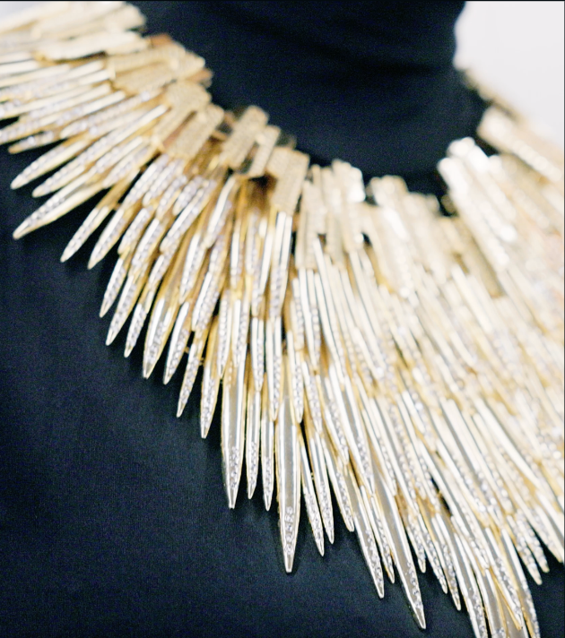 His design features a cuff made of wood and gold, decorated with diamonds. The cuff has a wing-like shape that resembles a dove, which is the universal symbol of peace. The wood used for the cuff is rare and exhibits different colors and patterns depending on the angle of light.